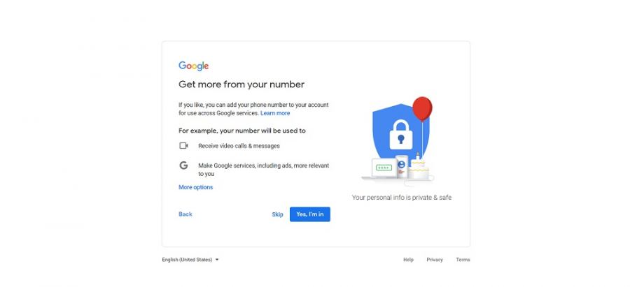 4. ستظهر لك صفحة جديدة للتحقق من هويتك، في الخانة الأولى ضع رقم هاتفك، في الخانة الثانية ضع بريد إلكتروني إحتياطي لاسترجاع حسابك في حالة نسيان كلمة المرور أو اسم الإيميل، وفي الخانة الثالثة ضع تاريخ ميلادك، وفي الخانة الرابع ضع جنسك، ومن ثم إضغط على التالي Next كما هو موضح بالصورة أدناه.